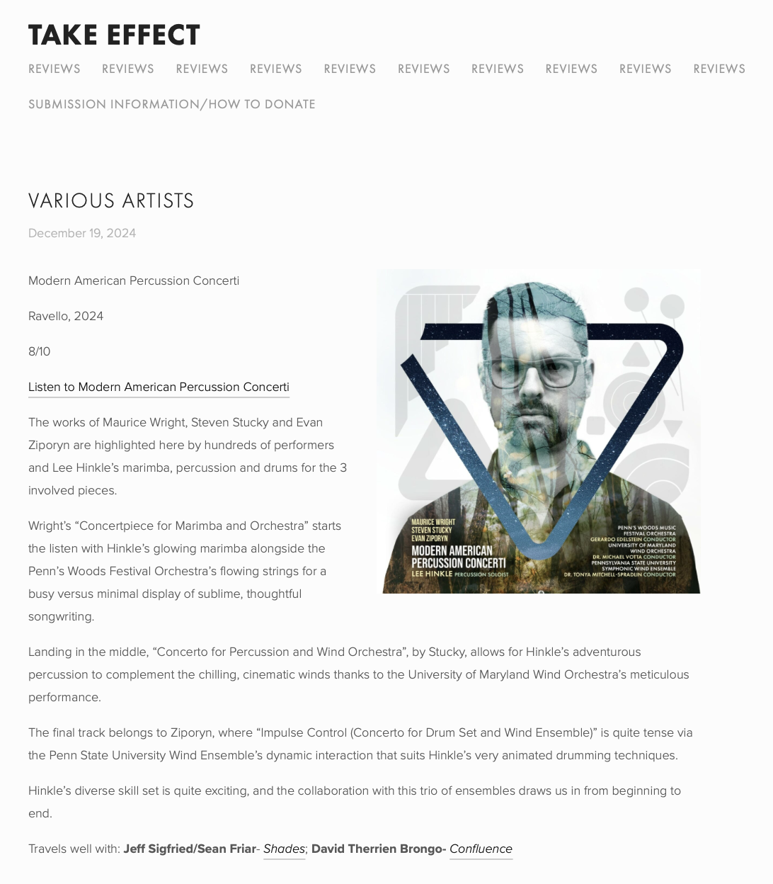 I’m thrilled to have yet another positive review of Modern American Percussion Concerti. Take Effect Reviews (https://takeeffectreviews.com) was so kind as to present this thoughtful review.